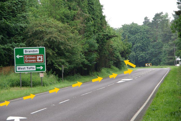 After about 5 miles on the A143 you will reach Lynford. Turn left on to a minor road (TL 820 911) (W3W dries.idealist.socket) signed 'Brandon and Grimes Graves'. |