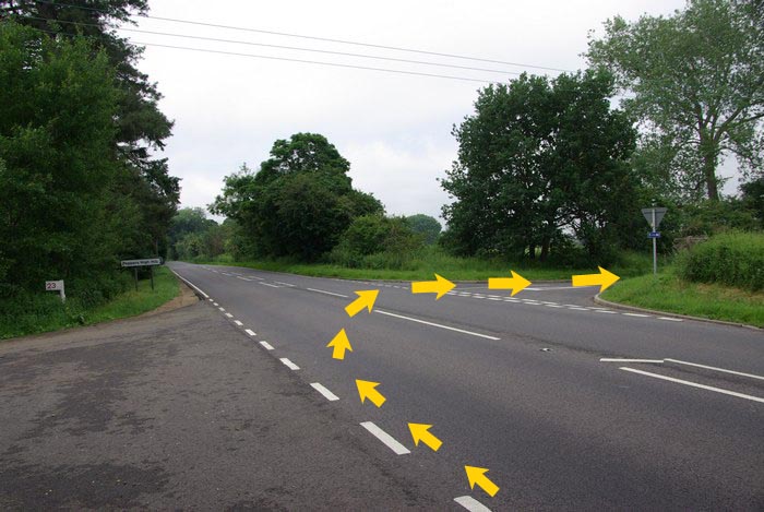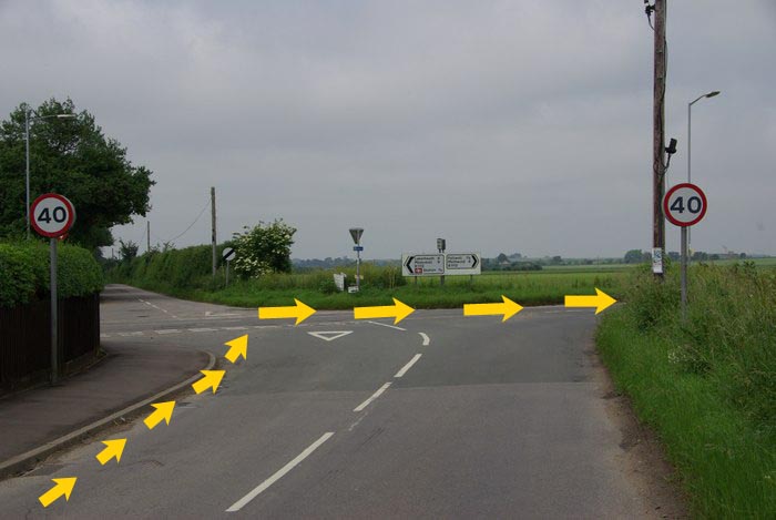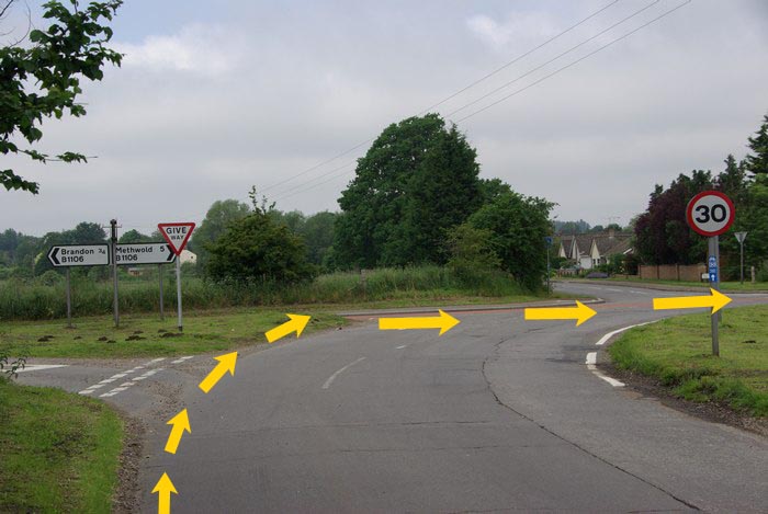At the crossroads (TL 781 881) (W3W plan.rungs.guideline) turn right into Weeting on the B1106 signed 'Methwold'. ⚠ Beware of oncoming traffic when turning right. |